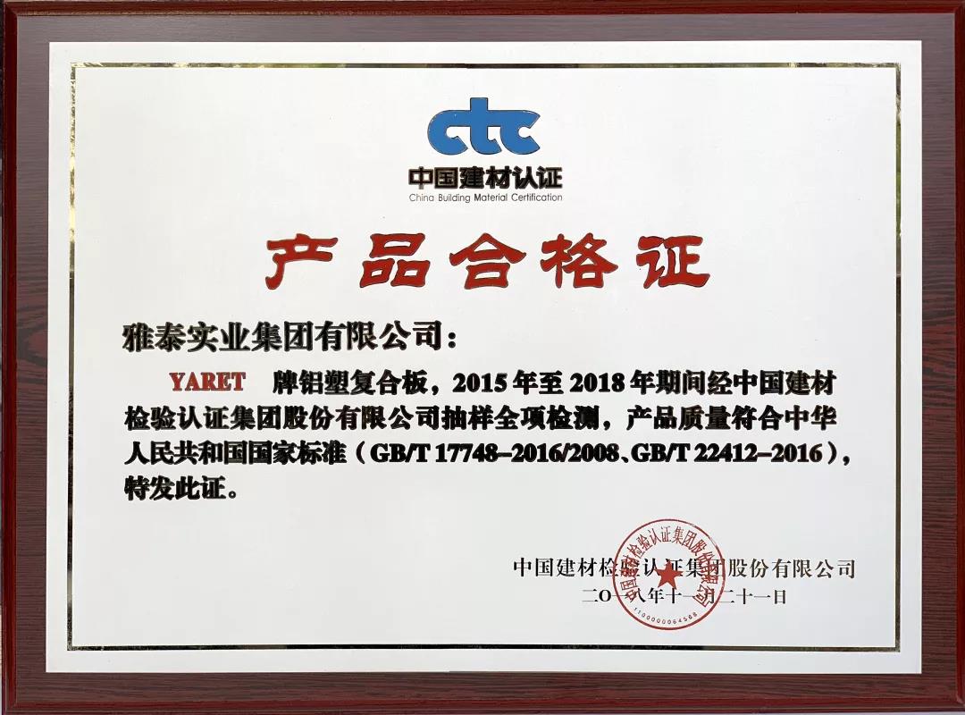 會上,雅泰產(chǎn)品憑借2008年至今2018年期間質(zhì)量體系持續(xù)滿足CTC/TVL-OP02《建筑裝飾用金屬及金屬復(fù)合材料產(chǎn)品認(rèn)證實(shí)施規(guī)則》,榮獲2018年度CTC產(chǎn)品質(zhì)量認(rèn)證優(yōu)秀獎(jiǎng)。YARET牌鋁塑復(fù)合板,2015年至2018年期間經(jīng)中國建材檢驗(yàn)認(rèn)證集團(tuán)股份有限公司抽樣全項(xiàng)檢測,產(chǎn)品質(zhì)量符合中華人民共和國國家標(biāo)準(zhǔn)(GB/T 17748-2016/2008、GB/T22412-2016),被授予2018年度產(chǎn)品合格證。