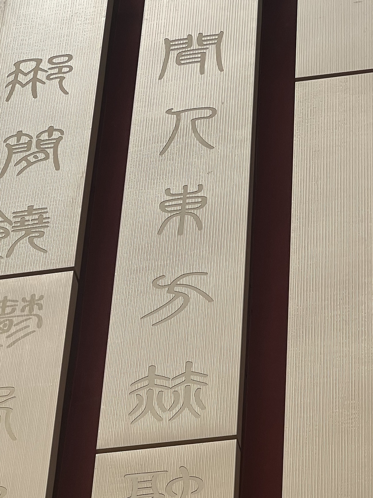 經(jīng)過一遍遍的編程、雕刻、噴涂嘗試,終于在5毫米鋁板上,用滿樘的浮雕工藝,生動(dòng)展示中國(guó)古代印章特征,塑造出風(fēng)化的蝕刻痕跡,將建筑外幕墻紅色印章和原色竹簡(jiǎn)生動(dòng)還原, 更好體現(xiàn)檔案館外觀上的年代感和內(nèi)含海派文化特有的底蘊(yùn)。