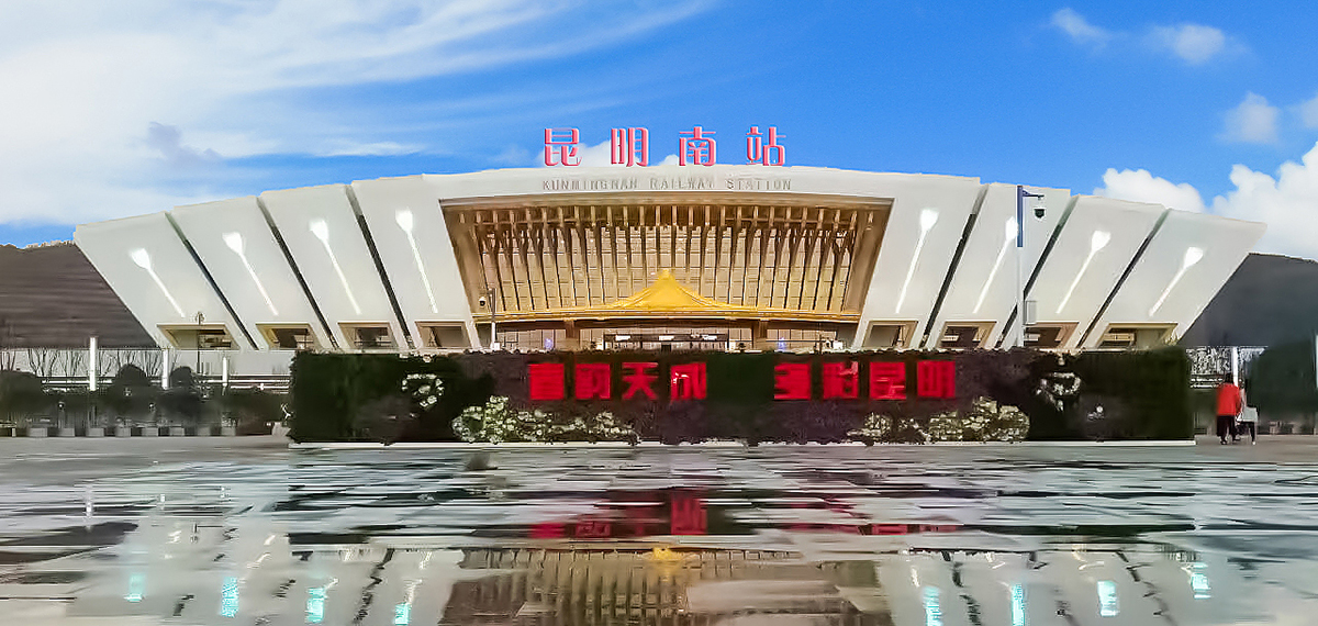 昆明南站(Kunming Nan Railway Station):位于云南省昆明市呈貢區(qū)吳家營街道白龍?zhí)渡侥_之西,坐東向西,東邊是山區(qū),西距昆明市政府大樓約3公里、滇池約7公里,南面是西南聯(lián)大舊址和呈貢大學(xué)城,北距昆明站約28公里。正面造型為孔雀開屏、鮮花綻放。